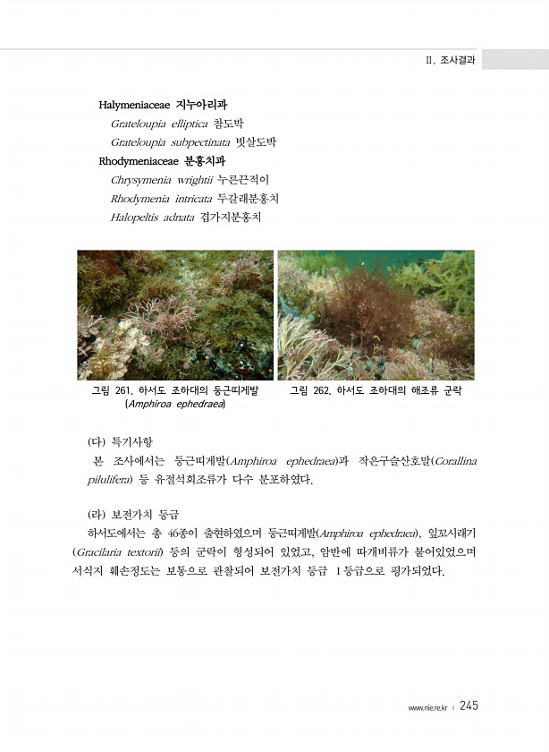 Ⅱ. 조사결과 www.nie.re.kr ? 245 Halymeniaceae 지누아리과 Grateloupia elliptica 참도박 Grateloupia subpectinata 빗살도박 Rhodymeniaceae 분홍치과 Chrysymenia wrightii 누른끈적이 Rhodymenia intricata 두갈래분홍치 Halopeltis adnata 겹가지분홍치 그림 261. 하서도 조하대의 둥근띠게발 Amphiroa ephedraea 그림 262. 하서도 조하대의 해조류 군락 다 특기사항 본 조사에서는 둥근띠게발 Amphiroa ephedraea 과 작은구슬산호말 Corallina pilulifera 등 유절석회조류가 다수 분포하였다. 라 보전가치 등급 하서도에서는 총 46종이 출현하였으며 둥근띠게발 Am...