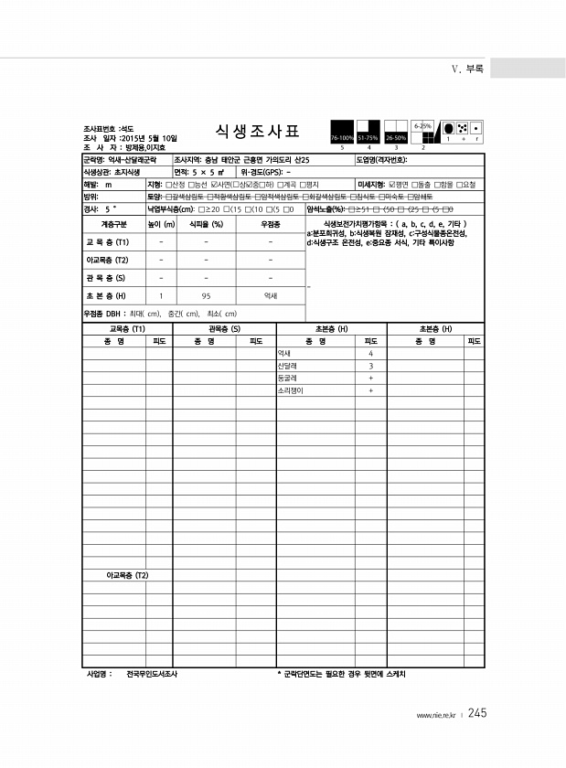 Ⅴ. 부록 www.nie.re.kr ? 245 조사표번호 석도 조사 일자 2015년 5월 10일 조 사 자 방제용,이지효 식 생 조 사 표 군락명억새-산달래군락 조사지역충남 태안군 근흥면 가의도리 산25 도엽명 격자번호 식생상관초지식생 면적5 × 5 ㎡ 위·경도 GPS 해발m 지형□산정 □능선 ?사면 ?상?중□하 □계곡 □평지 미세지형?평면 □돌출 □함몰 □요철 방위토양□갈색삼림토 □적황색삼림토 □암적색삼림토 □회갈색삼림토 □침식토 □미숙토 □암쇄토 경사5 ° 낙엽부식층 cm □≥20 ? 15 □ 10 □ 5 □0 암석노출 % □≥51 □〈50 □〈25 □〈5 □0 계층구분 높이 m 식피율 % 우점종 식생보전가치평가항목 a, b, c, d, e, 기타 a분포희귀성, b식생복원 잠재성, c구성식물종온전성, 교...