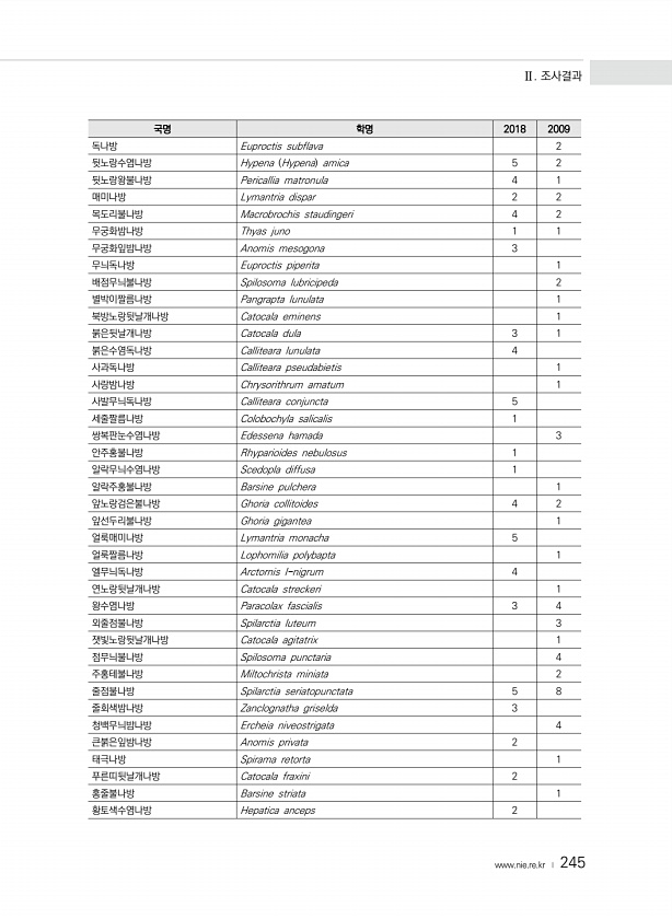 Ⅱ. 조사결과 www.nie.re.kr ? 245 국명 학명 2018 2009 독나방 Euproctis subflava 2 뒷노랑수염나방 Hypena Hypena amica 5 2 뒷노랑왕불나방 Pericallia matronula 4 1 매미나방 Lymantria dispar 2 2 목도리불나방 Macrobrochis staudingeri 4 2 무궁화밤나방 Thyas juno 1 1 무궁화잎밤나방 Anomis mesogona 3 무늬독나방 Euproctis piperita 1 배점무늬불나방 Spilosoma lubricipeda 2 별박이짤름나방 Pangrapta lunulata 1 북방노랑뒷날개나방 Catocala eminens 1 붉은뒷날개나방 Catocala dula 3 1 붉은수염독나방 Calli...