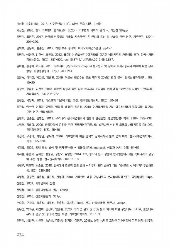 234 기상청 기후정책과. 2018. 지구온난화 1.5℃ SPM 주요 내용. 기상청 기상청. 2020. 한국 기후변화 평가보고서 2020 ? 기후변화 과학적 근거 -. 기상청 362pp 김민기, 최영은. 2017. 한국의 여름철과 겨울철 지속극한기온 현상의 특성 및 변화에 관한 연구, 기후연구. 12 4 305-320. 김백호, 김용재, 황순진. 2019. 하천·호수 생태학. 바이오사이언스출판. pp457 김병식, 성장현, 강현석, 조천호. 2012. 표준강수 증발산지수 SPEI 를 이용한 남한지역의 가뭄심도 평가. 한국수자원 학회논문집. 45 9 887-900, doi10.3741/ JKWRA.2012.45.9.887. 김아름, 김영채, 이도훈. 2018. 뉴트리아 Myocastor coypus 분포밀도 ...