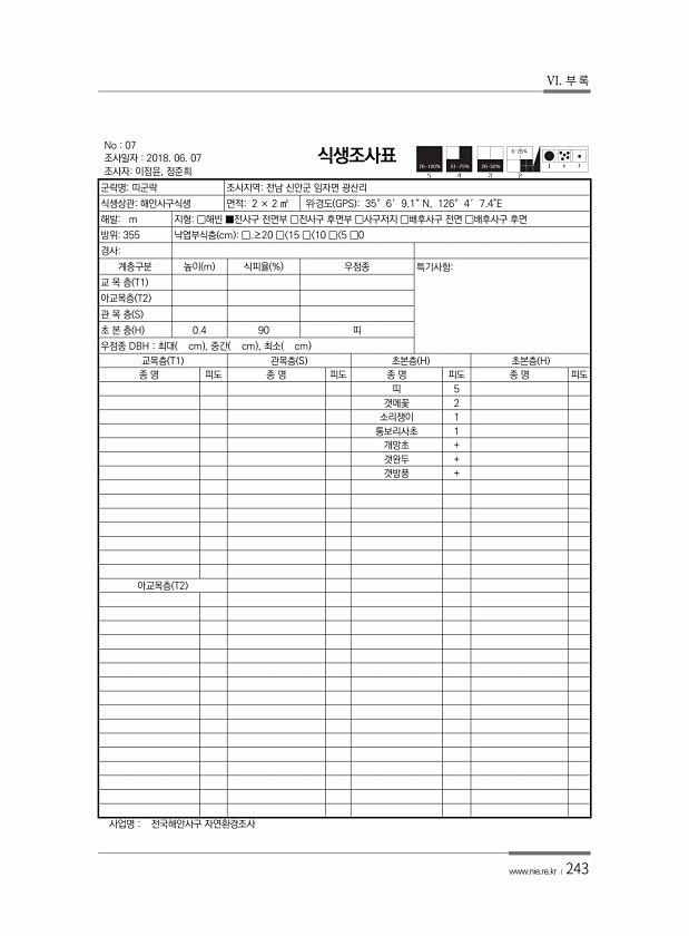 VI. 부 록 www.nie.re.kr ?243 No 07 조사일자 2018. 06. 07 조사자이정윤, 정준희 식생조사표 군락명띠군락 조사지역전남 신안군 임자면 광산리 식생상관해안사구식생 면적2 × 2 ㎡ 위?경도 GPS 35° 6′ 9.1″ N, 126° 4′ 7.4E 해발m 지형□해빈 ■전사구 전면부 □전사구 후면부 □사구저지 □배후사구 전면 □배후사구 후면 방위355 낙엽부식층 cm □.≥20 □ 15 □ 10 □ 5 □0 경사계층구분 높이 m 식피율 % 우점종 특기사항교 목 층 T1 아교목층 T2 관 목 층 S 초 본 층 H 0.4 90 띠 우점종 DBH 최대 cm , 중간 cm , 최소 cm 교목층 T1 관목층 S 초본층 H 초본층 H 종 명 피도 종 명 피도 종 명 피도 종 명 피도 띠 5 갯메...