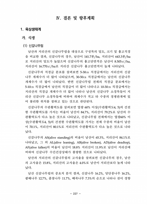 227 Ⅳ. 결론 및 향후계획 1. 육상생태계 가. 식생 1 신갈나무림 남산과 지리산의 신갈나무림을 대상으로 구성목의 밀도, 크기 및 흉고직경 을 비교한 결과, 신갈나무의 경우, 남산이 141.7본/ha, 지리산이 643.3본/ha 로 지리산의 밀도가 높았으며 신갈나무의 흉고단면적은 남산이 8.505㎡/ha, 지리산이 16.770㎡/ha로 지리산 신갈나무 흉고단면적이 높게 나타났다. 신갈나무의 직경급 분포를 살펴보면 5-30㎝ 직경급에서는 지리산의 신갈 나무 개체수가 더 많이 나타났으며, 30-50㎝ 직경급에서는 남산의 신갈나무 개체수가 더 많이 나타났다. 반면 신갈나무림 전체의 직경급 분포에서는 5-10㎝ 직경급에서 남산의 직경급이 더 많이 나타나고 10-30㎝ 직경급에서는 지리산의 직경급 개체수가 더 많...