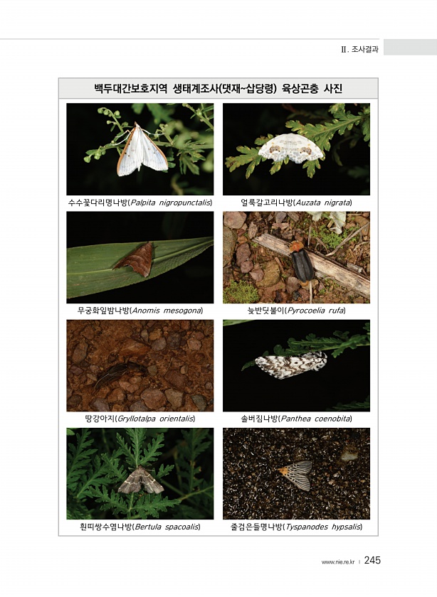 Ⅱ. 조사결과 www.nie.re.kr ? 245 백두대간보호지역 생태계조사 댓재삽당령 육상곤충 사진 수수꽃다리명나방 Palpita nigropunctalis 얼룩갈고리나방 Auzata nigrata 무궁화잎밤나방 Anomis mesogona 늦반딧불이 Pyrocoelia rufa 땅강아지 Gryllotalpa orientalis 솔버짐나방 Panthea coenobita 흰띠쌍수염나방 Bertula spacoalis 줄검은들명나방 Tyspanodes hypsalis