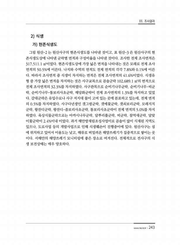 III. 조사결과 www.nie.re.kr ?243 2 그림 원산-2 는 원산사구의 현존식생도를 나타낸 것이고, 표 원산-3 은 원산사구의 현 존식생도상에 나타낸 군락별 면적과 구성비율을 나타낸 것이다. 조사한 전체 조사면적은 317,511.1 ㎡이었다. 현존식생도상에 가장 넓은 면적을 나타내는 것은 모래로 전체 조사 면적의 50.5%에 이른다. 나지와 수역의 면적도 전체 면적의 각각 7.8%와 0.1%에 이른 다. 따라서 조사면적 중 식생이 차지하는 면적은 전체 조사면적의 41.6%이었다. 식생유 형 중 가장 넓은 면적을 차지하는 것은 사구교목으로 곰솔군락 102,689.1 ㎡의 면적으로 전체 조사면적의 32.3%를 차지하였다. 사구관목으로 순비기나무군락, 순비기나무-띠군 락, 순비기나무-통보리사초군락, ...