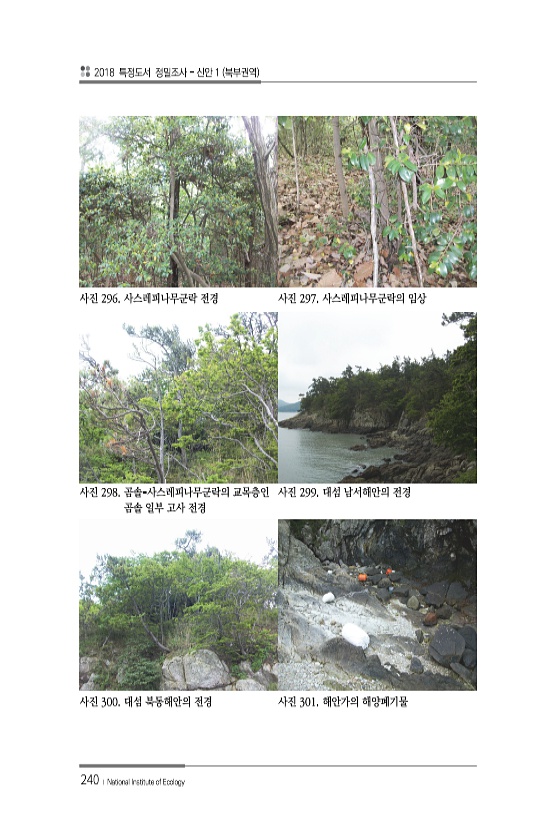 2018 특정도서 정밀조사 신안 1 북부권역 240 ? National Institute of Ecology 사진 296. 사스레피나무군락 전경 사진 297. 사스레피나무군락의 임상 사진 298. 곰솔-사스레피나무군락의 교목층인 곰솔 일부 고사 전경 사진 299. 대섬 남서해안의 전경 사진 300. 대섬 북동해안의 전경 사진 301. 해안가의해양폐기물