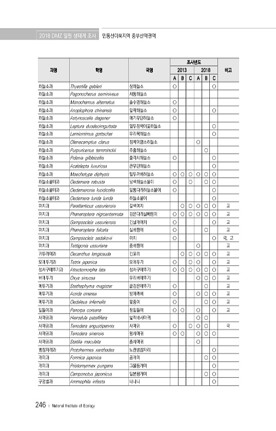 2018 DMZ 일원 생태계 조사 민통선이북지역 중부산악권역 246 ? National Institute of Ecology 과명 학명 국명 조사년도 2013 2018 비고 A B C A B C 하늘소과 Thyestilla gebleri 삼하늘소 ○ ○ 하늘소과 Pogonocherus seminiveus 새똥하늘소 하늘소과 Monochamus alternatus 솔수염하늘소 ○ 하늘소과 Anoplophora chinensis 알락하늘소 ○ ○ 하늘소과 Astynoscelis degener 애기우단하늘소 ○ 하늘소과 Leptura duodecimguttata 열두점박이꽃하늘소 ○ 하늘소과 Lamiomimus gottschei 우리목하늘소 ○ 하늘소과 Olenecamptus clarus 점박이염소하늘소 ○ 하늘...