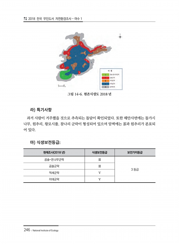 2018 전국 무인도서 자연환경조사 여수 1 246 ? National Institute of Ecology 그림 14-6. 현존식생도 2018 년 과거 사람이 거주했을 것으로 추측되는 돌담이 확인되었다. 또한 해안사면에는 돌가시 나무, 원추리, 왕모시풀, 참나리 군락이 형성되어 있으며 암벽에는 칡과 원추리가 분포되 어 있다. 현재조사 2018 년 식생보전등급 보전가치등급 곰솔-돈나무군락 Ⅲ 3 등급 곰솔군락 Ⅲ 억새군락 Ⅴ 이대군락Ⅴ