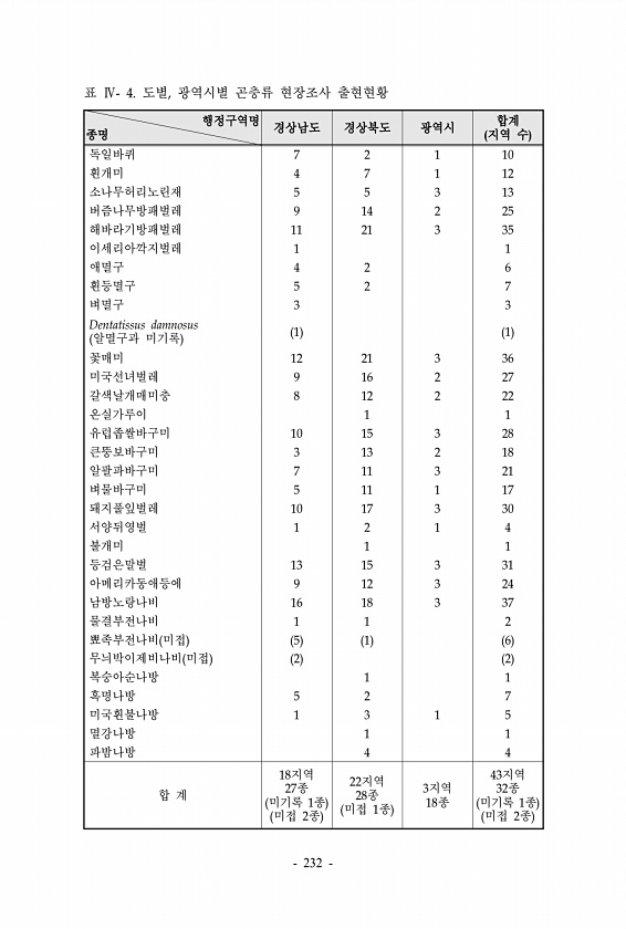 행정구역명 종명 경상남도 경상북도 광역시 지역 수 합계 독일바퀴 7 2 1 10 흰개미 4 7 1 12 소나무허리노린재 5 5 3 13 버즘나무방패벌레 9 14 2 25 해바라기방패벌레 11 21 3 35 이세리아깍지벌레 1 1 애멸구 4 2 6 흰등멸구 5 2 7 벼멸구 3 3 Dentatissus damnosus 알멸구과 미기록 1 1 꽃매미 12 21 3 36 미국선녀벌레 9 16 2 27 갈색날개매미충 8 12 2 22 온실가루이 1 1 유럽좁쌀바구미 10 15 3 28 큰뚱보바구미 3 13 2 18 알팔파바구미 7 11 3 21 벼물바구미 5 11 1 17 돼지풀잎벌레 10 17 3 30 서양뒤영벌 1 2 1 4 불개미 1 1 등검은말벌 13 15 3 31 아메리카동애등에 9 12 3 24 남방노랑...