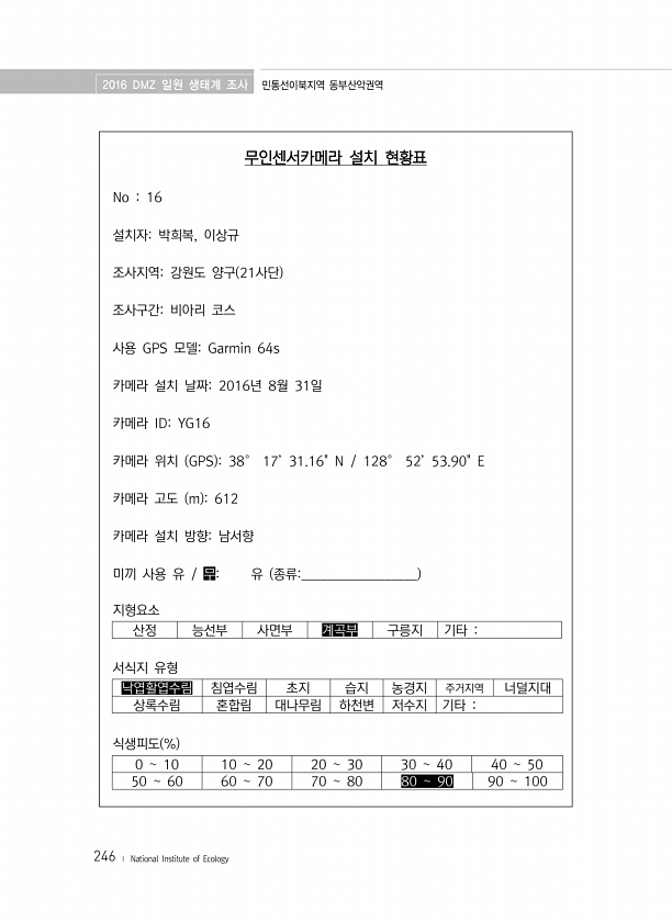 2016 DMZ 일원 생태계 조사 민통선이북지역 동부산악권역 246 ? National Institute of Ecology 무인센서카메라 설치 현황표 No 16 설치자박희복, 이상규 조사지역강원도 양구 21사단 조사구간비아리 코스 사용 GPS 모델Garmin 64s 카메라 설치 날짜2016년 8월 31일 카메라 IDYG16 카메라 위치 GPS 38° 17’ 31.16N 128° 52’ 53.90E 카메라 고도 m 612 카메라 설치 방향남서향 미끼 사용 유 무유 종류__________________ 지형요소 산정 능선부 사면부 계곡부 구릉지 기타 서식지 유형 낙엽활엽수림 침엽수림 초지 습지 농경지 주거지역 너덜지대 상록수림 혼합림 대나무림 하천변 저수지 기타 식생피도 % 0 10 10 20 20 30 30...