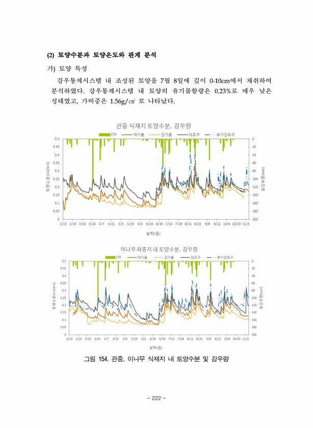 2 토양수분과 토양온도와 관계 분석 가 토양 특성 강우통제시스템 내 조성된 토양을 7월 8일에 깊이 0-10cm에서 채취하여 분석하였다. 강우통제시스템 내 토양의 유기물함량은 0.23%로 매우 낮은 성태였고, 가비중은 1.56g/㎤ 로 나타났다. 그림 154. 관중, 이나무 식재지 내 토양수분 및 강우량 222