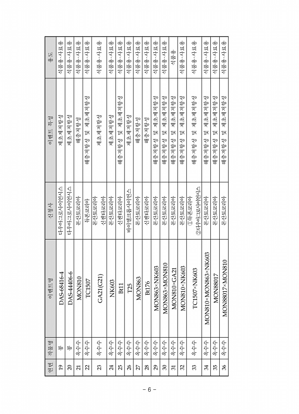 19 콩 DAS-68416-4 다우아그로사이언시스 제초제저항성 식품용·사료용 20 콩 DAS-44406-6 다우아그로사이언시스 제초제저항성 식품용·사료용 21 옥수수 MON810 몬산토코리아 해충저항성 식품용·사료용 22 옥수수 TC1507 듀폰코리아 해충저항성 및 제초제저항성 식품용·사료용 23 옥수수 GA21 G21 몬산토코리아 신젠타코리아 제초제저항성 식품용·사료용 24 옥수수 NK603 몬산토코리아 제초제저항성 식품용·사료용 25 옥수수 Bt11 신젠타코리아 해충저항성 및 제초제저항성 식품용·사료용 26 옥수수 T25 바이엘크롭사이언스 제초제저항성 식품용·사료용 27 옥수수 MON863 몬산토코리아 해충저항성 식품용·사료용 28 옥수수 Bt176 신젠타코리아 해충저항성 식품용·사료용 29 옥수수 MO...