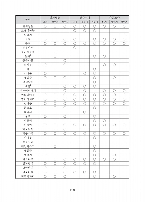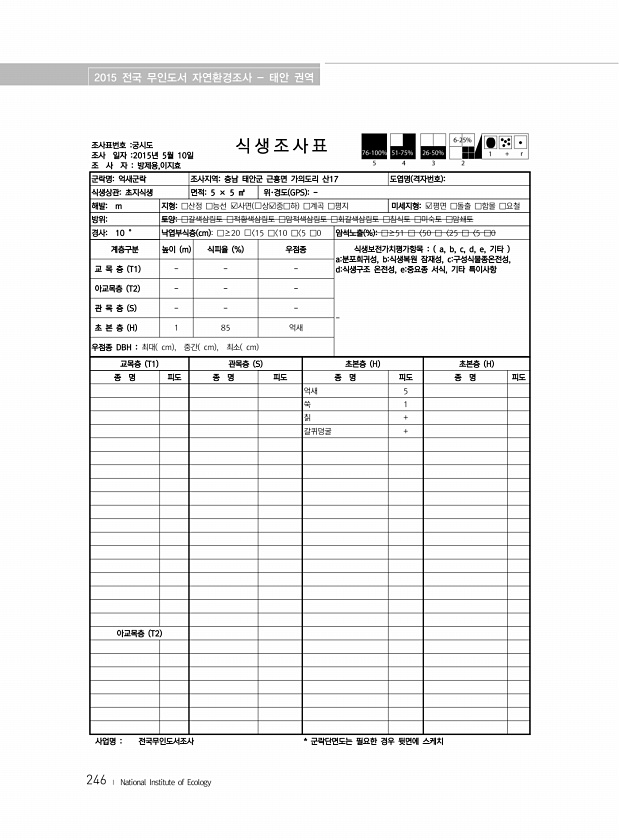 2015 전국 무인도서 자연환경조사 태안 권역 246 ? National Institute of Ecology 조사표번호 궁시도 조사 일자 2015년 5월 10일 조 사 자 방제용,이지효 식 생 조 사 표 군락명억새군락 조사지역충남 태안군 근흥면 가의도리 산17 도엽명 격자번호 식생상관초지식생 면적5 × 5 ㎡ 위·경도 GPS 해발m 지형□산정 □능선 ?사면 ?상?중□하 □계곡 □평지 미세지형?평면 □돌출 □함몰 □요철 방위토양□갈색삼림토 □적황색삼림토 □암적색삼림토 □회갈색삼림토 □침식토 □미숙토 □암쇄토 경사10 ° 낙엽부식층 cm □≥20 ? 15 □ 10 □ 5 □0 암석노출 % □≥51 □〈50 □〈25 □〈5 □0 계층구분 높이 m 식피율 % 우점종 식생보전가치평가항목 a, b, c, d, e, ...