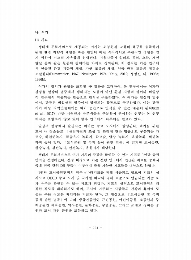 224 나. 여가 1 개요 생태계 문화서비스로 제공되는 여가는 외부환경 교류의 욕구를 충족하기 위해 환경 지향적 체험을 하는 개인이 어떤 즉각적이고 주관적인 경험을 얻 기 위하여 비교적 자유롭게 선택된다. 이용자들이 임의로 휴식, 오락, 개인 발달 등과 같은 활동에 참여하는 가치로 정의된다. 이 정의는 기존 연구에 서 언급된 환경 지향적 체험, 자연 교류의 체험, 인공 환경 교류의 체험을 포괄한다 Dumazedier, 1967; Neulinger, 1974; Kelly, 2012; 성영신 외, 1996a; 1996b 여가의 정의가 관광을 포함할 수 있음을 고려하여, 본 연구에서는 여가와 관광을 일상의 범주에서 행해지는 노동이 아닌 환경 지향적 행위와 비일상 적 범주에서 적용되는 활동으로 편의상 구분하였다. ...
