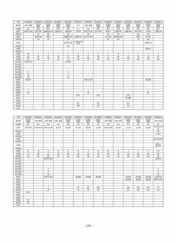 구분 동공원28 동공원29 동공원30 동공원31 동공원32 동공원33 동공원34 동공원35 동공원36 동공원37 동공원38 동공원39 동공원40 동공원41 중분류 산림 활엽 조경수 활엽 조경수 활엽 조경수 활엽 조경수 활엽 초지 산림 활엽 조경수 활엽 조경수 활엽 조경수 활엽 조경수 활엽 조경수 활엽 조경수 침엽 조경수 활엽 소분류 A4 B16 B21 B12 B15 C1 A4 B19 B13 B18 B21 B14 B5 B21 교목1 아까시나무 살구나무 대왕참나무 이팝나무 이팝나무 전나무 아까시나무 살구나무 복자기 은행나무 회화나무 계수나무 소나무 단풍나무 교목1% 70 80 40 90 80 60 90 50 교목2 단풍나무 목련 대왕참나무 은행나무 상수리나무 느티나무 양버즘나무 목련 잣나무 교목2% 30 20 ...