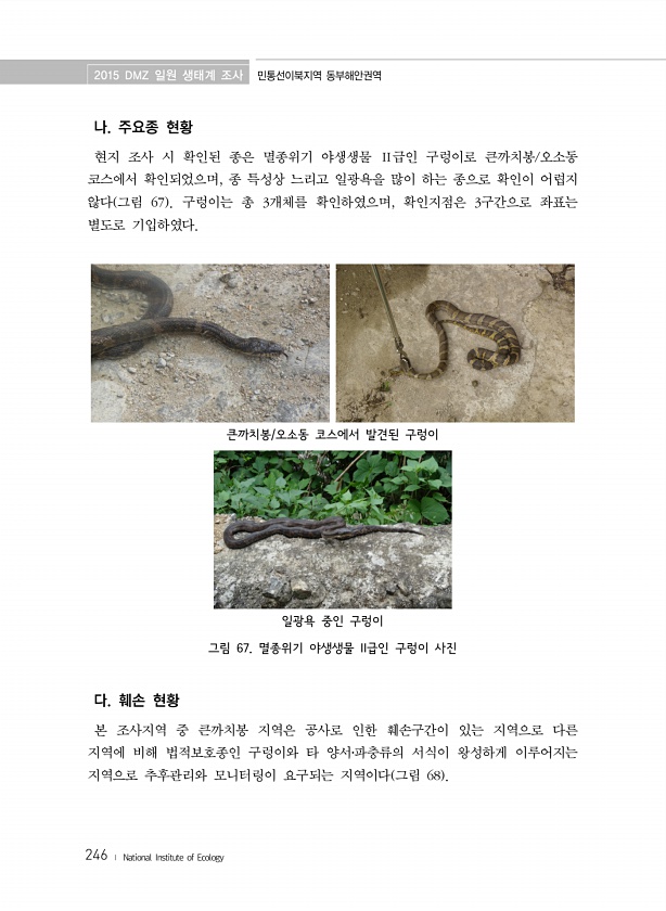 2015 DMZ 일원 생태계 조사 민통선이북지역 동부해안권역 246 ? National Institute of Ecology 나. 주요종 현황 현지 조사 시 확인된 종은 멸종위기 야생생물 Ⅱ급인 구렁이로 큰까치봉/오소동 코스에서 확인되었으며, 종 특성상 느리고 일광욕을 많이 하는 종으로 확인이 어렵지 않다 그림 67 구렁이는 총 3개체를 확인하였으며, 확인지점은 3구간으로 좌표는 별도로 기입하였다. 큰까치봉/오소동 코스에서 발견된 구렁이 일광욕 중인 구렁이 그림 67. 멸종위기 야생생물 II급인 구렁이 사진 다. 훼손 현황 본 조사지역 중 큰까치봉 지역은 공사로 인한 훼손구간이 있는 지역으로 다른 지역에 비해 법적보호종인 구렁이와 타 양서?파충류의 서식이 왕성하게 이루어지는 지역으로 추후관리와 모니터링이 요...
