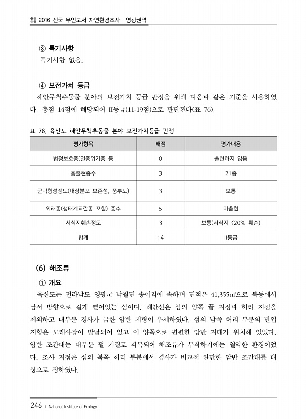 2016 전국 무인도서 자연환경조사 영광권역 246 ? National Institute of Ecology ③ 특기사항 특기사항 없음. ④ 보전가치 등급 해안무척추동물 분야의 보전가치 등급 판정을 위해 다음과 같은 기준을 사용하였 다. 총점 14점에 해당되어 II등급 11-19점 으로 판단된다 표 76 표 76. 육산도 해안무척추동물 분야 보전가치등급 판정 평가항목 배점 평가내용 법정보호종 멸종위기종 등 0 출현하지 않음 총출현종수 3 21종 군락형성정도 대상분포 보존성, 풍부도 3 보통 외래종 생태계교란종 포함 종수 5 미출현 서식지훼손정도 3 보통 서식지 20% 훼손 합계 14 II등급 6 해조류 ① 개요 육산도는 전라남도 영광군 낙월면 송이리에 속하며 면적은 41,355㎡으로 북동에서 남서 방향으로 ...