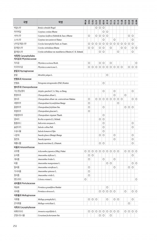252 박달나무 Betula schmidtii Regel ○ ○ ○ 까치박달 Carpinus cordata Blume ○ ○ 서어나무 Carpinus laxifora Siebold & Zucc. Blume ○ ○ ○ ○ ○ ○ ○ 소사나무 Carpinus turczaninowii Hance ○ ○ ○ 난티잎개암나무 Corylus heterophylla Fisch. ex Trautv. ○ ○ ○ ○ ○ ○ ○ ○ ○ ○ ○ ○ ○ 참개암나무 Corylus sieboldiana Blume ○ ○ ○ ○ ○ ○ ○ ○ ○ 물개암나무 Corylus sieboldiana var. mandshurica Maxim. C. K. Schneid. ○ ○ ○ ○ 석죽목 Caryophyllales 자리공과 Phytolaccac...