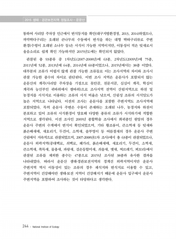 2015 생태·경관보전지역 정밀조사 운문산 244 ? National Institute of Ecology 통하여 사리암 주차장 인근에서 번식둥지를 확인 대구지방환경청, 2013, 2014 하였으나, 까막딱다구리는 오래된 큰나무의 수동에서 번식을 하는 대형 딱따구리류로 주변 환경 수령이 오래된 소나무 등 은 서식이 가능한 지역이지만, 이동성이 적은 텃새로서 울음소리로 쉽게 확인 가능하지만 2015년도에는 확인되지 않았다. 관찰된 총 93종류 중 1차년도 2007-2008년 에 63종, 2차년도 2009년 에 75종, 2011년에 52종, 2013년에 64종, 2014년에 60종이었으나, 2015년에서는 38종 이었다. 대부분의 조류가 어렵지 않게 관찰 가능한 조류들로 이는 조사지역의 차이와 조사시 관찰 가능...