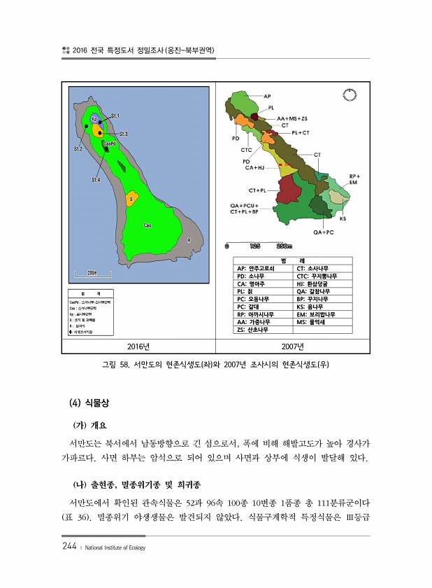 2016 전국 특정도서 정밀조사 옹진-북부권역 244 ? National Institute of Ecology 범 례 AP만주고로쇠 CT소사나무 PD소나무 CTC꾸지뽕나무 CA명아주 HJ환삼덩굴 PL칡 QA갈참나무 PC오동나무 BP꾸지나무 PC갈대 KS음나무 RP아까시나무 EM보리밥나무 AA가중나무 MS물억새 ZS산초나무 2016년 2007년 그림 58. 서만도의 현존식생도 좌 와 2007년 조사시의 현존식생도 우 4 식물상 가 개요 서만도는 북서에서 남동방향으로 긴 섬으로서, 폭에 비해 해발고도가 높아 경사가 가파르다. 사면 하부는 암석으로 되어 있으며 사면과 상부에 식생이 발달해 있다. 나 출현종, 멸종위기종 및 희귀종 서만도에서 확인된 관속식물은 52과 96속 100종 10변종 1품종 총 111분류군이...