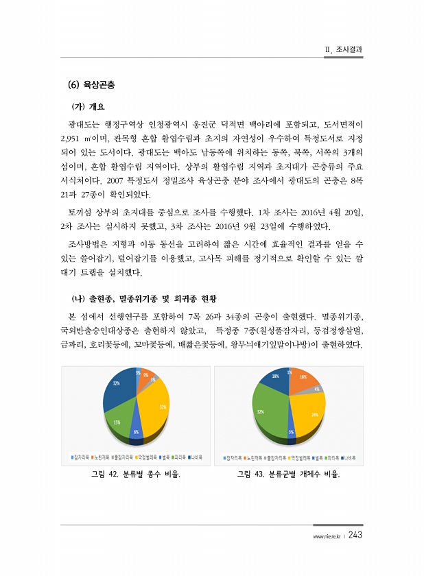 Ⅱ. 조사결과 www.nie.re.kr ? 243 6 육상곤충 가 개요 광대도는 행정구역상 인청광역시 옹진군 덕적면 백아리에 포함되고, 도서면적이 2,951 ㎡이며, 관목형 혼합 활엽수림과 초지의 자연성이 우수하여 특정도서로 지정 되어 있는 도서이다. 광대도는 백아도 남동쪽에 위치하는 동쪽, 북쪽, 서쪽의 3개의 섬이며, 혼합 활엽수림 지역이다. 상부의 활엽수림 지역과 초지대가 곤충류의 주요 서식처이다. 2007 특정도서 정밀조사 육상곤충 분야 조사에서 광대도의 곤충은 8목 21과 27종이 확인되었다. 토끼섬 상부의 초지대를 중심으로 조사를 수행했다. 1차 조사는 2016년 4월 20일, 2차 조사는 실시하지 못했고, 3차 조사는 2016년 9월 23일에 수행하였다. 조사방법은 지형과 이동 동선을 고려하여 ...