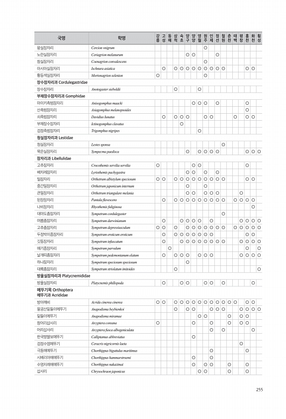 255 왕실잠자리 Cercion vnigrum ○ 노란실잠자리 Ceriagrion melanurum ○ ○ ○ 참실잠자리 Coenagrion convalescens ○ 아시아실잠자리 Ischnura asiatica ○ ○ ○ ○ ○ ○ ○ ○ ○ ○ ○ ○ 황등색실잠자리 Mortonagrion selenion ○ ○ 장수잠자리과 Cordulegastridae 장수잠자리 Anotogaster sieboldii ○ ○ 부채장수잠자리과 Gomphidae 마이키측범잠자리 Anisogomphus maacki ○ ○ ○ ○ ○ 산측범잠자리 Asiagomphus melanopsoides ○ 쇠측범잠자리 Davidius Iunatus ○ ○ ○ ○ ○ ○ ○ ○ ○ 부채장수잠자리 Ictinogomphus clavatus ...