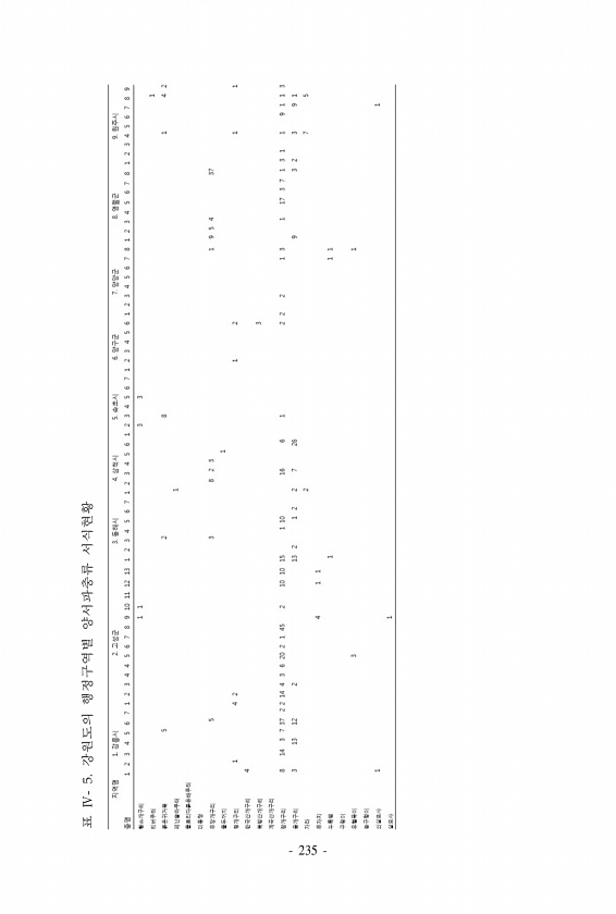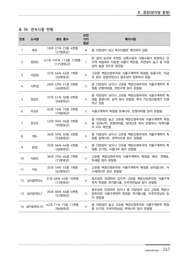 Ⅲ. 종합 분야별 총평 www.nie.re.kr ? 247 표 59. 관속식물 현황 번호 도서명 분포 종수 보전 가치 등급 특이사항 1 흑도 18과 27속 23종 4변종 27분류군 Ⅲ 종 다양성이 낮고 특이식물은 확인되지 않음 2 광대도 61과 105속 113종 12변종 125분류군 Ⅰ 본 섬의 능선부 주변은 상록수림과 낙엽수림이 혼생하고 있 으며 하층에서 다양한 식물이 확인됨. 자연성이 높고 종 다양 성이 높을 것으로 판단됨 3 서당섬 37과 64속 62종 7변종 69분류군 Ⅱ 고유종 백운산원추리와 식물구계학적 특정종 층꽃나무, 자금 우 등이 관찰되었으나 종조성이 양호하지 않음 4 시투섬 28과 43속 41종 5변종 46분류군 Ⅱ 종 다양성이 낮으나 고유종 백운산원추리와 식물구계학적 특 정종 큰꿩의비름, ...