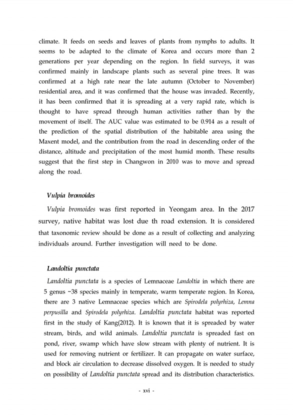 xvi climate. It feeds on seeds and leaves of plants from nymphs to adults. It seems to be adapted to the climate of Korea and occurs more than 2 generations per year depending on the region. In field surveys, it was confirmed mainly in landscape plants such as several pine trees. It was confirmed at a high rate near the late autumn October to November residential area, and it was confirmed that th...