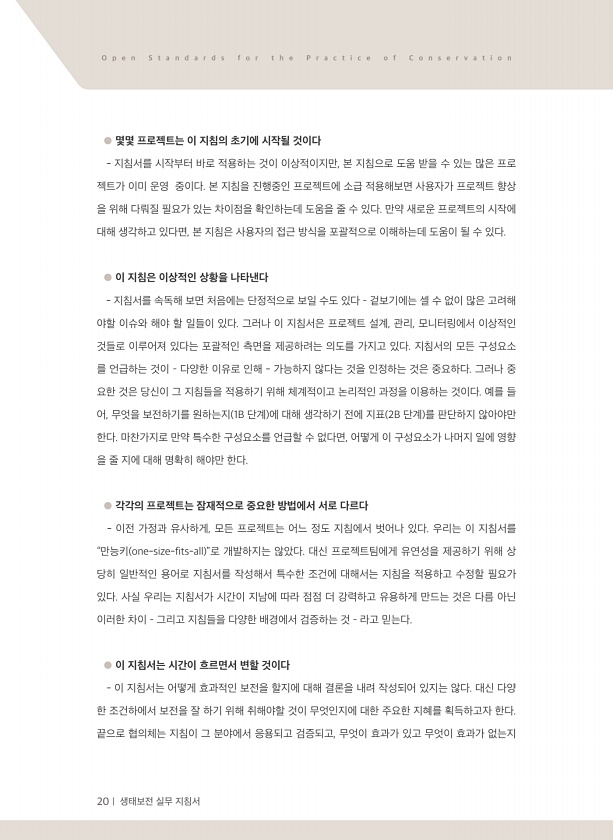 20 | 생태보전 실무 지침서 O p e n S t a n d a r d s f o r t h e P r a c t i c e o f C o n s e r v a t i o n ● 몇몇 프로젝트는 이 지침의 초기에 시작될 것이다 지침서를 시작부터 바로 적용하는 것이 이상적이지만, 본 지침으로 도움 받을 수 있는 많은 프로 젝트가 이미 운영 중이다. 본 지침을 진행중인 프로젝트에 소급 적용해보면 사용자가 프로젝트 향상 을 위해 다뤄질 필요가 있는 차이점을 확인하는데 도움을 줄 수 있다. 만약 새로운 프로젝트의 시작에 대해 생각하고 있다면, 본 지침은 사용자의 접근 방식을 포괄적으로 이해하는데 도움이 될 수 있다. ● 이 지침은 이상적인 상황을 나타낸다 지침서를 속독해 보면 처음에는 단정적으로 보일 수도 있다 ...