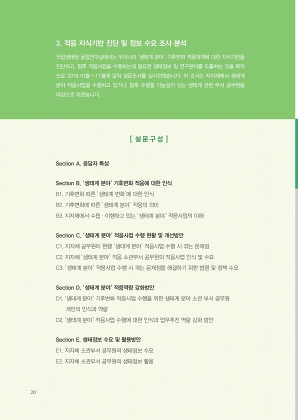 Section A. 응답자 특성 Section B. ‘생태계 분야’ 기후변화 적응에 대한 인식 B1. 기후변화 따른 ‘생태계 변화’에 대한 인식 B2. 기후변화에 따른 ‘생태계 분야’ 적응의 의미 B3. 지자체에서 수립·이행하고 있는 ‘생태계 분야’ 적응사업의 이해 Section C. ‘생태계 분야’ 적응사업 수행 현황 및 개선방안 C1. 지자체 공무원이 현행 ‘생태계 분야’ 적응사업 수행 시 겪는 문제점 C2. 지자체 ‘생태계 분야’ 적응 소관부서 공무원의 적응사업 인식 및 수요 C3. ‘생태계 분야’ 적응사업 수행 시 겪는 문제점을 해결하기 위한 법령 및 정책 수요 Section D. ‘생태계 분야’ 적응역량 강화방안 D1. ‘생태계 분야’ 기후변화 적응사업 수행을 위한 생태계 분야 소관 부서 공무원 개...
