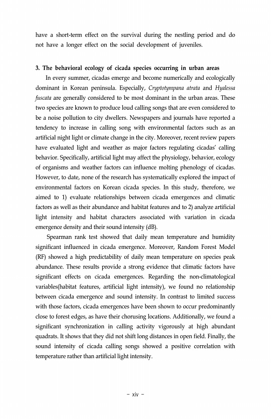 have a short-term effect on the survival during the nestling period and do not have a longer effect on the social development of juveniles. 3. The behavioral ecology of cicada species occurring in urban areas In every summer, cicadas emerge and become numerically and ecologically dominant in Korean peninsula. Especially, Cryptotympana atrata and Hyalessa fuscata are generally considered to be most...