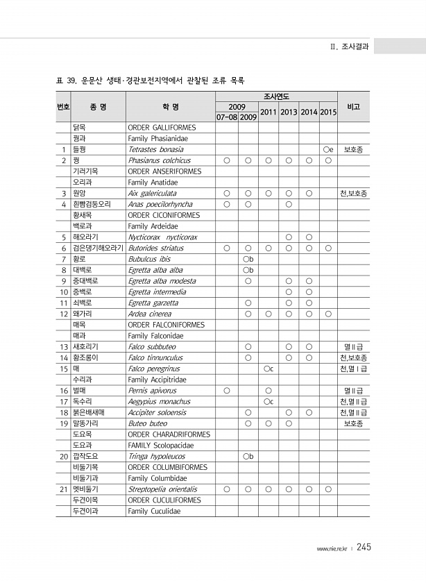 Ⅱ. 조사결과 www.nie.re.kr ? 245 번호 종 명 학 명 조사연도 2009 비고 2011 2013 2014 2015 07-08 2009 닭목 ORDER GALLIFORMES 꿩과 Family Phasianidae 1 들꿩 Tetrastes bonasia ○e 보호종 2 꿩 Phasianus colchicus ○ ○ ○ ○ ○ ○ 기러기목 ORDER ANSERIFORMES 오리과 Family Anatidae 3 원앙 Aix galericulata ○ ○ ○ ○ ○ 천,보호종 4 흰뺨검둥오리 Anas poecilorhyncha ○ ○ ○ 황새목 ORDER CICONIFORMES 백로과 Family Ardeidae 5 해오라기 Nycticorax nycticorax ○ ○ 6 검은댕기해오라기 Buto...