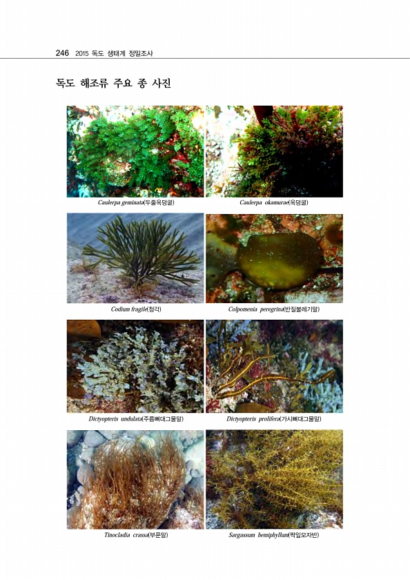 246 2015 독도 생태계 정밀조사 독도 해조류 주요 종 사진 Caulerpa geminata 두줄옥덩굴 Caulerpa okamurae 옥덩굴 Codium fragile 청각 Colpomenia peregrina 반질불레기말 Dictyopteris undulata 주름뼈대그물말 Dictyopteris prolifera 가시뼈대그물말 Tinocladia crassa 부푼말 Sargassum hemiphyllum 짝잎모자반