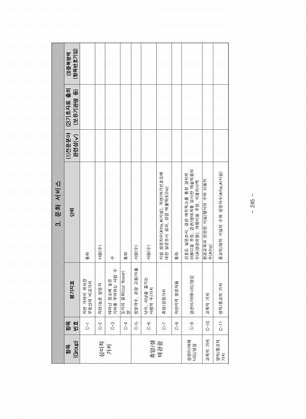 245 심미적 가치 C-1 자연 가까이 위치한 부동산의 비교가치 통화 C-2 자연/농촌 방문자 사람 수 C-3 태어난 장소에 높은 가치를 부여하는 사람 수 수 C-4 도시의 절화 cut flower 양 통화 휴양/생 태관광 C-5 방문객수, 관광 고용/지출 사람 수 C-6 낚시, 사냥을 즐기는 사람의 수/가치 사람 수 C-7 휴양/관광가치 시설 방문자수 #/ha,#/시설 , 자연/여가선호도에 대한 설문조사 결과, 관광 매출액 €/ha C-8 자연지역 방문자들 통화 경관미/어메 니티/영감 C-9 경관미/어메니티/영감 선호도 설문조사, 경관 매트릭스를 통한 경치의 아름다움 추정, 경관/생태계를 묘사한 예술작품의 수 #/경관유형 , 여행비용 추정, 지불의사액 교육적 가치 C-10 교육적 가치 환경교육과 연관된 시...