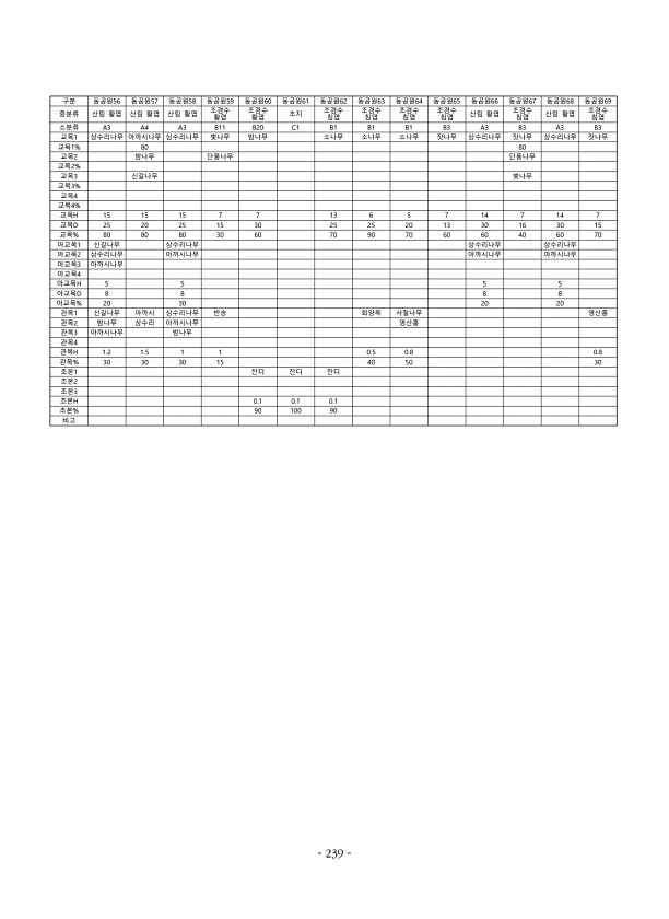 구분 동공원56 동공원57 동공원58 동공원59 동공원60 동공원61 동공원62 동공원63 동공원64 동공원65 동공원66 동공원67 동공원68 동공원69 중분류 산림 활엽 산림 활엽 산림 활엽 조경수 활엽 조경수 활엽 초지 조경수 침엽 조경수 침엽 조경수 침엽 조경수 침엽 산림 활엽 조경수 침엽 산림 활엽 조경수 침엽 소분류 A3 A4 A3 B11 B20 C1 B1 B1 B1 B3 A3 B3 A3 B3 교목1 상수리나무 아까시나무 상수리나무 벚나무 밤나무 소나무 소나무 소나무 잣나무 상수리나무 잣나무 상수리나무 잣나무 교목1% 80 80 교목2 밤나무 단풍나무 단풍나무 교목2% 교목3 신갈나무 벚나무 교목3% 교목4 교목4% 교목H 15 15 15 7 7 13 6 5 7 14 7 14 7 교목D 25 20...