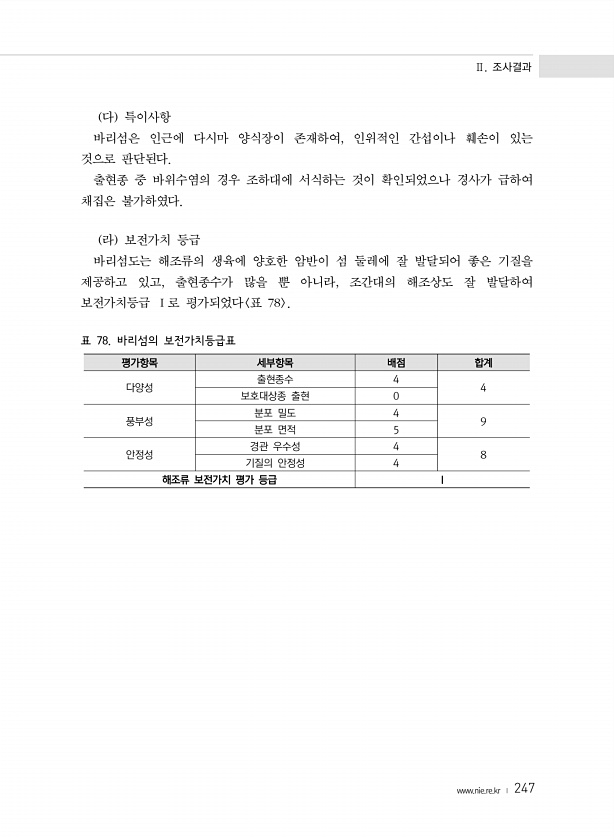 Ⅱ. 조사결과 www.nie.re.kr ? 247 다 특이사항 바리섬은 인근에 다시마 양식장이 존재하여, 인위적인 간섭이나 훼손이 있는 것으로 판단된다. 출현종 중 바위수염의 경우 조하대에 서식하는 것이 확인되었으나 경사가 급하여 채집은 불가하였다. 라 보전가치 등급 바리섬도는 해조류의 생육에 양호한 암반이 섬 둘레에 잘 발달되어 좋은 기질을 제공하고 있고, 출현종수가 많을 뿐 아니라, 조간대의 해조상도 잘 발달하여 보전가치등급 Ⅰ로 평가되었다 표 78 표 78. 바리섬의 보전가치등급표 평가항목 세부항목 배점 합계 다양성 출현종수 4 4 보호대상종 출현 0 풍부성 분포 밀도 4 9 분포 면적 5 안정성 경관 우수성 4 8 기질의 안정성 4 해조류 보전가치 평가 등급Ⅰ