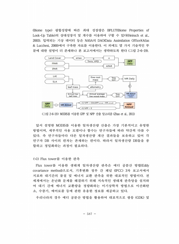 587 Biome type 광합성량에 따른 최대 성장량은 BPLUT Biome Properties of Look-Up Table 의 상대성장식 및 계수를 이용하여 구할 수 있다 Heinsch et al., 2003 입력되는 기상 데이터 등은 NASA의 DAO Data Assimilation Office Atlas & Lucchesi, 2000 에서 구축한 자료를 이용한다. 이 외에도 몇 가지 기술적인 부 분에 대한 설명이 더 존재하나 본 보고서에서는 생략하도록 한다 그림 2-6-19 그림 2-6-19 MODIS를 이용한 GPP 및 NPP 산출 알고리즘 Zhao et al., 2011 앞서 설명한 MODIS를 이용한 일차생산량 산출은 가장 기본적이고 유명한 방법이며, 세부적인 사용 모델이나 함수는 연구자들에 ...