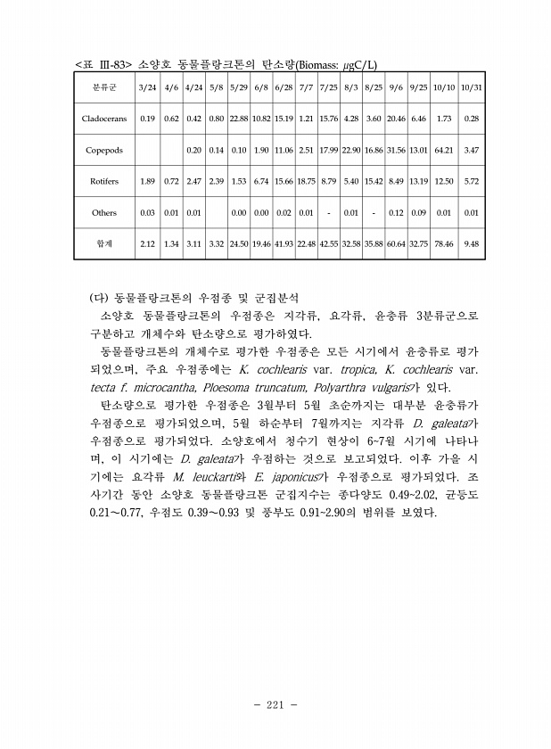 221 표 Ⅲ-83 소양호 동물플랑크톤의 탄소량 Biomass?gC/L 분류군 3/24 4/6 4/24 5/8 5/29 6/8 6/28 7/7 7/25 8/3 8/25 9/6 9/25 10/10 10/31 Cladocerans 0.19 0.62 0.42 0.80 22.88 10.82 15.19 1.21 15.76 4.28 3.60 20.46 6.46 1.73 0.28 Copepods 0.20 0.14 0.10 1.90 11.06 2.51 17.99 22.90 16.86 31.56 13.01 64.21 3.47 Rotifers 1.89 0.72 2.47 2.39 1.53 6.74 15.66 18.75 8.79 5.40 15.42 8.49 13.19 12.50 5.72 Others 0.03 0.01 0.01 0...