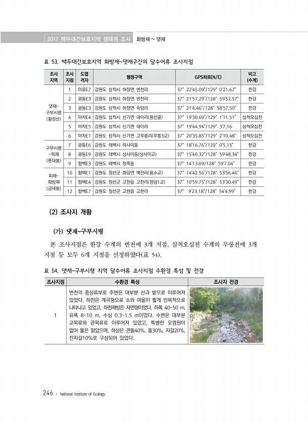 2017 백두대간보호지역 생태계 조사 화방재 댓재 246 ? National Institute of Ecology 조사지점 수환경 특성 조사지 전경 1 번천의 중상류부로 주변은 대부분 산과 밭으로 이루어져 있었다. 하천은 계곡형으로 소와 여울이 짧게 반복적으로 나타나고 있었고, 하천재방은 자연형이었다. 하폭 4050 m, 유폭 810 m, 수심 0.31.5 m이었다. 수변은 대부분 교목류와 관목류로 이루어져 있었고, 특별한 오염원이 없어 물은 맑았으며, 하상은 큰돌40%, 돌30%, 자갈20%, 잔자갈10%로 구성되어 있었다. 조사 지역 조사 지점 도엽 격자 행정구역 GPS좌표 N/E 수계 비고 댓재구부시령 황장산 1 미로E7 강원도 삼척시 하장면 번천리 37°2245.09/129°021.67한강 2 광동E...