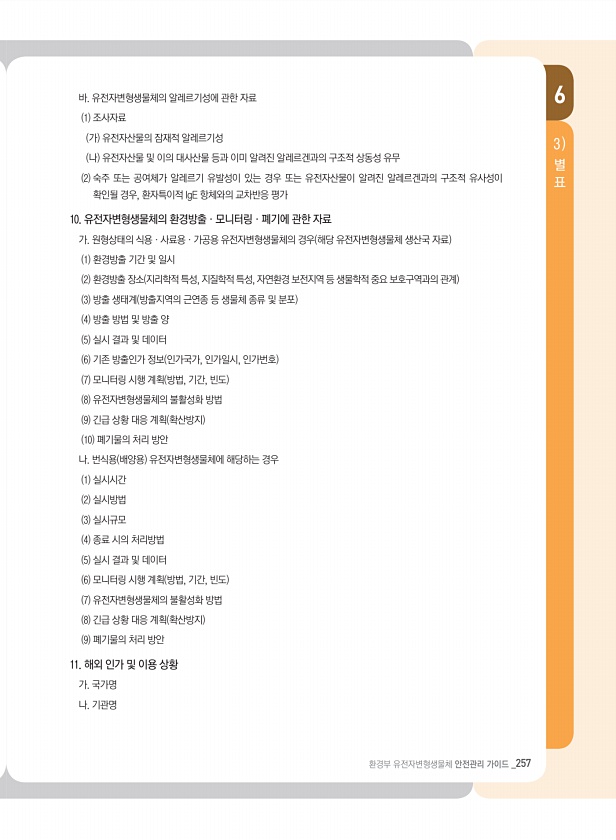 환경부 유전자변형생물체 안전관리 가이드 _257 6 별 표 3 바. 유전자변형생물체의 알레르기성에 관한 자료 1 조사자료 가 유전자산물의 잠재적 알레르기성 나 유전자산물 및 이의 대사산물 등과 이미 알려진 알레르겐과의 구조적 상동성 유무 2 숙주 또는 공여체가 알레르기 유발성이 있는 경우 또는 유전자산물이 알려진 알레르겐과의 구조적 유사성이 확인될 경우, 환자특이적 IgE 항체와의 교차반응 평가 10. 유전자변형생물체의 환경방출·모니터링·폐기에 관한 자료 가. 원형상태의 식용·사료용·가공용 유전자변형생물체의 경우 해당 유전자변형생물체 생산국 자료 1 환경방출 기간 및 일시 2 환경방출 장소 지리학적 특성, 지질학적 특성, 자연환경 보전지역 등 생물학적 중요 보호구역과의 관계 3 방출 생태계 방출지역의 근연종...