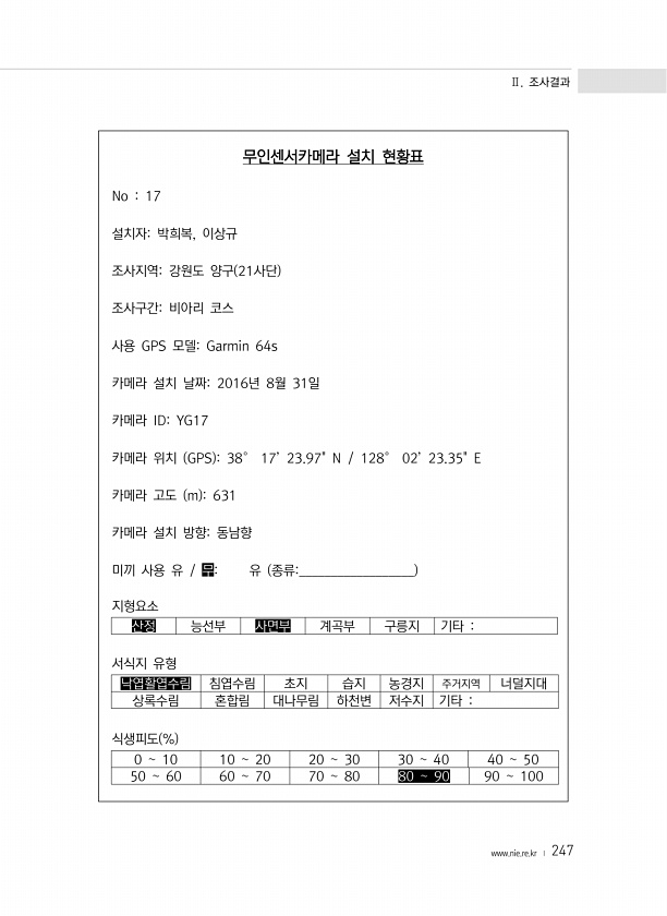Ⅱ. 조사결과 www.nie.re.kr ? 247 무인센서카메라 설치 현황표 No 17 설치자박희복, 이상규 조사지역강원도 양구 21사단 조사구간비아리 코스 사용 GPS 모델Garmin 64s 카메라 설치 날짜2016년 8월 31일 카메라 IDYG17 카메라 위치 GPS 38° 17’ 23.97N 128° 02’ 23.35E 카메라 고도 m 631 카메라 설치 방향동남향 미끼 사용 유 무유 종류__________________ 지형요소 산정 능선부 사면부 계곡부 구릉지 기타 서식지 유형 낙엽활엽수림 침엽수림 초지 습지 농경지 주거지역 너덜지대 상록수림 혼합림 대나무림 하천변 저수지 기타 식생피도 % 0 10 10 20 20 30 30 40 40 50 50 60 60 70 70 80 80 90 90 100