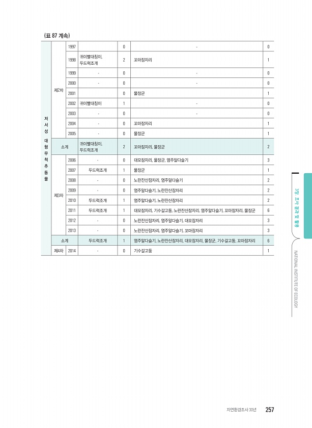 저 서 성 대 형 무 척 추 동 물 제2차 1997 0 0 1998 귀이빨대칭이, 두드럭조개 2 꼬마잠자리 1 1999 0 0 2000 0 0 2001 0 물장군 1 2002 귀이빨대칭이 1 0 2003 0 0 2004 0 꼬마잠자리 1 2005 0 물장군 1 소계 귀이빨대칭이, 두드럭조개 2 꼬마잠자리, 물장군 2 제3차 2006 0 대모잠자리, 물장군, 염주알다슬기 3 2007 두드럭조개 1 물장군 1 2008 0 노란잔산잠자리, 염주알다슬기 2 2009 0 염주알다슬기, 노란잔산잠자리 2 2010 두드럭조개 1 염주알다슬기, 노란잔산잠자리 2 2011 두드럭조개 1 대모잠자리, 기수갈고둥, 노란잔산잠자리, 염주알다슬기, 꼬마잠자리, 물장군 6 2012 0 노란잔산잠자리, 염주알다슬기, 대모잠자리 3 2...