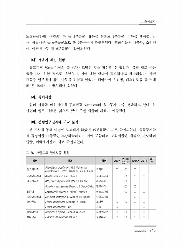 Ⅱ. 조사결과 www.nie.re.kr ? 245 과명 학명 국명 2007 2010? 2014* 2015* 2016 비고 ** 잔고사리과 Pteridium aquilinum L. Kuhn var. latiusculum Desv. Underw. ex A. Heller 고사리 ○ ○ ○ 꼬리고사리과 Asplenium incisum Thunb. 꼬리고사리 ○ ○ ○ 개고사리과 Athyrium niponicum Mett. Hance 개고사리 ○ Athyrium yokoscense Franch. & Sav. Christ. 뱀고사리 ○ ○ 관중과 Dryopteris lacera Thunb. Kuntze 비늘고사리 ○ ○ ○ 넉줄고사리과 Davallia mariesii T. Moore ex Baker 넉줄고사리 ○ 소나...