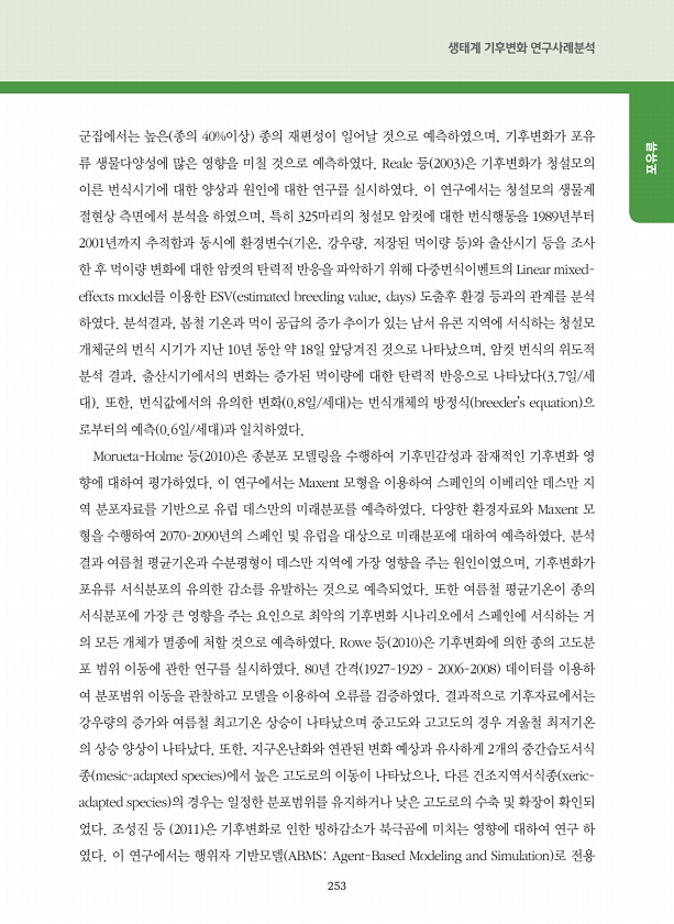 253 생태계 기후변화 연구사례분석 포유류 군집에서는 높은 종의 40%이상 종의 재편성이 일어날 것으로 예측하였으며, 기후변화가 포유 류 생물다양성에 많은 영향을 미칠 것으로 예측하였다. Reale 등 2003 은 기후변화가 청설모의 이른 번식시기에 대한 양상과 원인에 대한 연구를 실시하였다. 이 연구에서는 청설모의 생물계 절현상 측면에서 분석을 하였으며, 특히 325마리의 청설모 암컷에 대한 번식행동을 1989년부터 2001년까지 추적함과 동시에 환경변수 기온, 강우량, 저장된 먹이량 등 와 출산시기 등을 조사 한 후 먹이량 변화에 대한 암컷의 탄력적 반응을 파악하기 위해 다중번식이벤트의 Linear mixedeffects model를 이용한 ESV estimated breeding value, days ...