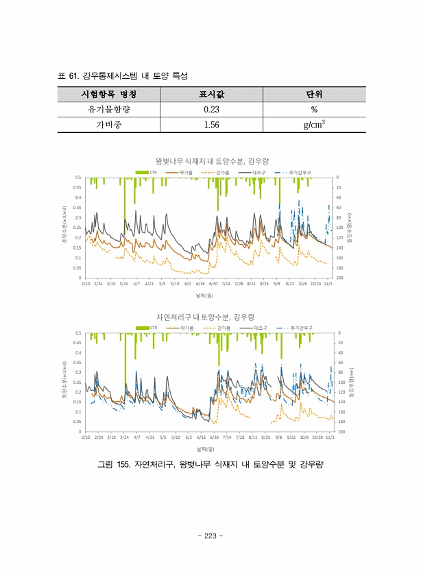 시험항목 명칭 표시값 단위 유기물함량 0.23 % 가비중 1.56 g/cm3 표 61. 강우통제시스템 내 토양 특성 그림 155. 자연처리구, 왕벚나무 식재지 내 토양수분 및 강우량 223
