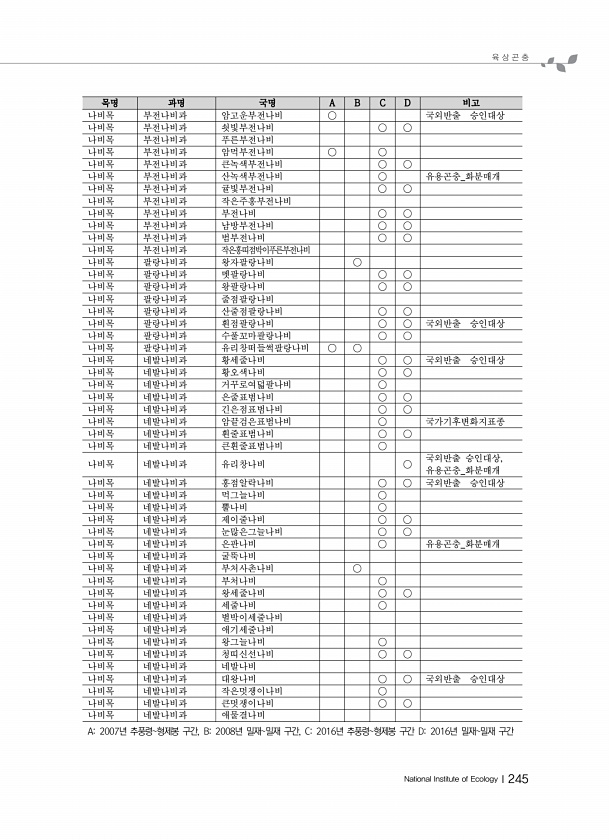 육 상 곤 충 National Institute of EcologyⅠ245 목명 과명 국명 A B C D 비고 나비목 부전나비과 암고운부전나비 ○ 국외반출 승인대상 나비목 부전나비과 쇳빛부전나비 ○ ○ 나비목 부전나비과 푸른부전나비 나비목 부전나비과 암먹부전나비 ○ ○ 나비목 부전나비과 큰녹색부전나비 ○ ○ 나비목 부전나비과 산녹색부전나비 ○ 유용곤충_화분매개 나비목 부전나비과 귤빛부전나비 ○ ○ 나비목 부전나비과 작은주홍부전나비 나비목 부전나비과 부전나비 ○ ○ 나비목 부전나비과 남방부전나비 ○ ○ 나비목 부전나비과 범부전나비 ○ ○ 나비목 부전나비과 작은홍띠점박이푸른부전나비 나비목 팔랑나비과 왕자팔랑나비 ○ 나비목 팔랑나비과 멧팔랑나비 ○ ○ 나비목 팔랑나비과 왕팔랑나비 ○ ○ 나비목 팔랑나비과 줄점팔랑...
