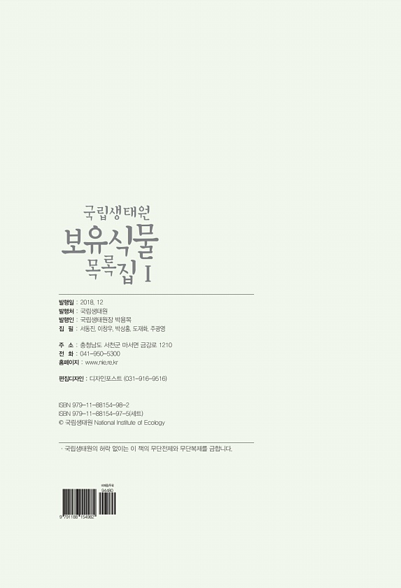 발행일 2018. 12 발행처 국립생태원 발행인 국립생태원장 박용목 집 필 서동진, 이창우, 박상홍, 도재화, 주광영 주 소 충청남도 서천군 마서면 금강로 1210 전 화 041-950-5300 홈페이지 www.nie.re.kr 편집디자인 디자인포스트 031-916-9516 ISBN 979-11-88154-98-2 ISBN 979-11-88154-97-5 세트 ? 국립생태원 National Institute of Ecology ·국립생태원의 허락 없이는 이 책의 무단전제와 무단복제를 금합니다. 9 791188 154982 94480 비매품/무료 Plants List of National Institute EcologyI