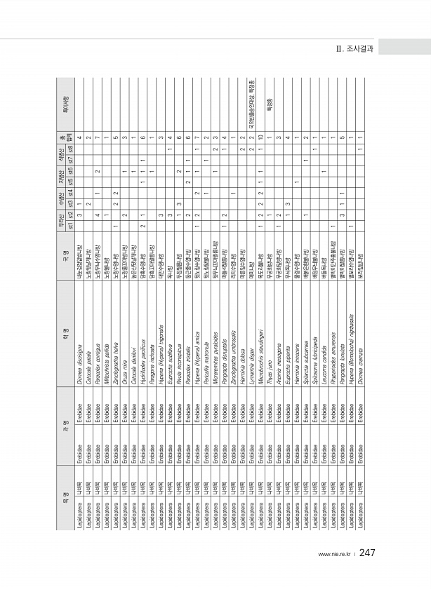 www ·nie·re·kr ? 247 목 명 과 명 학 명 국 명 두타산 수병산 자병산 석병산 총 st1 st2 st3 st4 st5 st6 st7 st8 합계 특이사항 Lepidoptera 나비목 Erebidae Erebidae Diomea discisigna 네눈검정잎밤나방 3 1 4 Lepidoptera 나비목 Erebidae Erebidae Catocala patala 노랑뒷날개나방 2 2 Lepidoptera 나비목 Erebidae Erebidae Paracolax contigua 노랑무늬수염나방 4 1 2 7 Lepidoptera 나비목 Erebidae Erebidae Miltochrista pallida 노랑불나방 1 1 Lepidoptera 나비목 Erebidae Erebidae Zanclog...