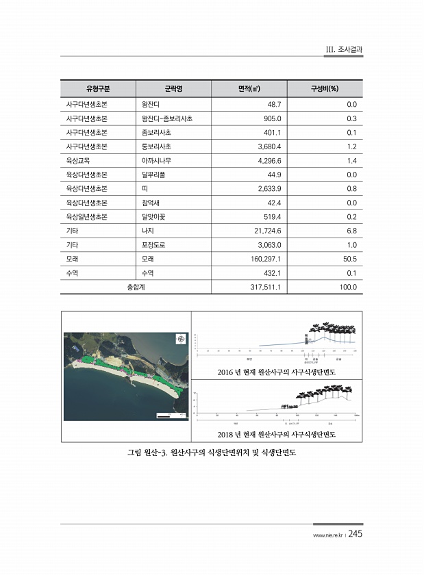 III. 조사결과 www.nie.re.kr ?245 2016 년 현재 원산사구의 사구식생단면도 2018 년 현재 원산사구의 사구식생단면도 그림 원산-3. 원산사구의 식생단면위치 및 식생단면도 유형구분 군락명 면적 ㎡ 구성비 % 사구다년생초본 왕잔디 48.7 0.0 사구다년생초본 왕잔디-좀보리사초 905.0 0.3 사구다년생초본 좀보리사초 401.1 0.1 사구다년생초본 통보리사초 3,680.4 1.2 육상교목 아까시나무 4,296.6 1.4 육상다년생초본 달뿌리풀 44.9 0.0 육상다년생초본 띠 2,633.9 0.8 육상다년생초본 참억새 42.4 0.0 육상일년생초본 달맞이꽃 519.4 0.2 기타 나지 21,724.6 6.8 기타 포장도로 3,063.0 1.0 모래 모래 160,297.1 50.5 수역 ...