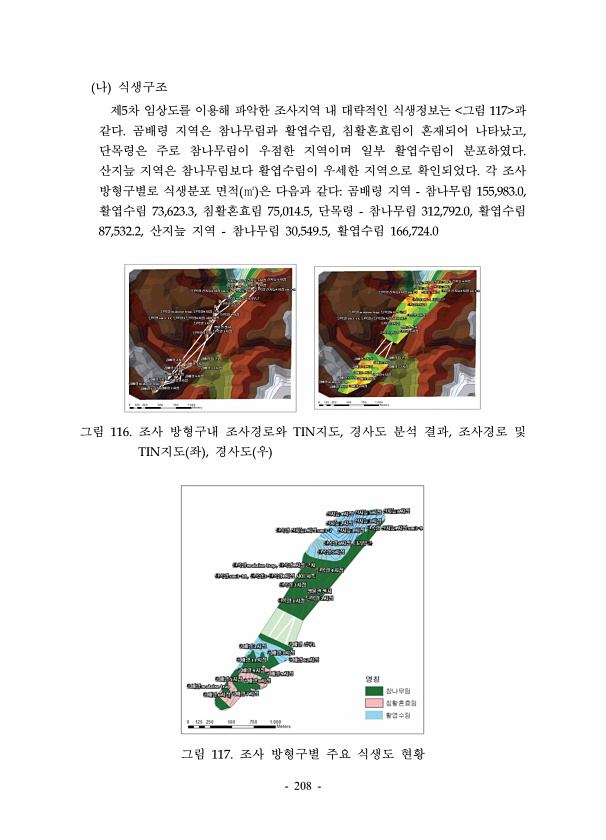 208 나 식생구조 제5차 임상도를 이용해 파악한 조사지역 내 대략적인 식생정보는 그림 117 과 같다. 곰배령 지역은 참나무림과 활엽수림, 침활혼효림이 혼재되어 나타났고, 단목령은 주로 참나무림이 우점한 지역이며 일부 활엽수림이 분포하였다. 산지늪 지역은 참나무림보다 활엽수림이 우세한 지역으로 확인되었다. 각 조사 방형구별로 식생분포 면적 ㎡ 은 다음과 같다곰배령 지역 참나무림 155,983.0, 활엽수림 73,623.3, 침활혼효림 75,014.5, 단목령 참나무림 312,792.0, 활엽수림 87,532.2, 산지늪 지역 참나무림 30,549.5, 활엽수림 166,724.0 그림 116. 조사 방형구내 조사경로와 TIN지도, 경사도 분석 결과, 조사경로 및 TIN지도 좌 , 경사도 우 그림 117. 조...