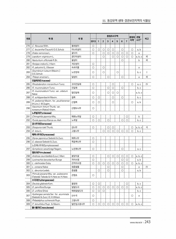 iii. 동강유역 생태·경관보전지역의 식물상 www.nie.re.kr ?243 번호 학 명 국 명 중점조사구역 중점외 지역* 관찰 시기** 비고 2013 1 2 3 4 5 6 7 276 C. flexuosa With. 황새냉이 ○ 277 C. leucantha Tausch O.E.Schulz 미나리냉이 ○ ○ ○ ○ ○ ○ ○ a, b 278 Draba nemorosa L. 꽃다지 ○ ○ ○ ○ ○ ○ ○ ○ a 279 Lepidium virginicum L. 콩다닥냉이 ○ ○ ○ ○ ○ ○ a, b, c 외 280 Nasturtium officinale R.Br. 물냉이 ○ b 외 281 Rorippa indica L. Hi...